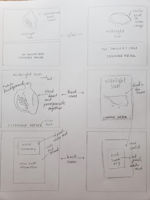 For my redesign, I decided to go with Midnight Sun by Stephenie Meyer, which is the companion novel to the very famous Twilight novel. This is the same story as the original, but from Edward's point of view instead of Bella. The original Twilight cover is of an apple that symbolizes the story of Adam and Eve and reflects Bella's desire to figure out the mystery behind Edward and his family, not knowing the danger she would be in after learning such knowledge. Similarly, the Midnight Sun cover's pomegranate reflects Edward's torment over falling for a human, knowing that his very existence in her life will always bring danger, not unlike the story of Hades and Persephone.